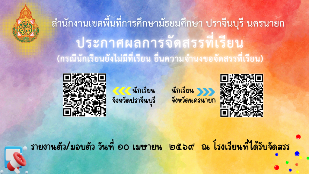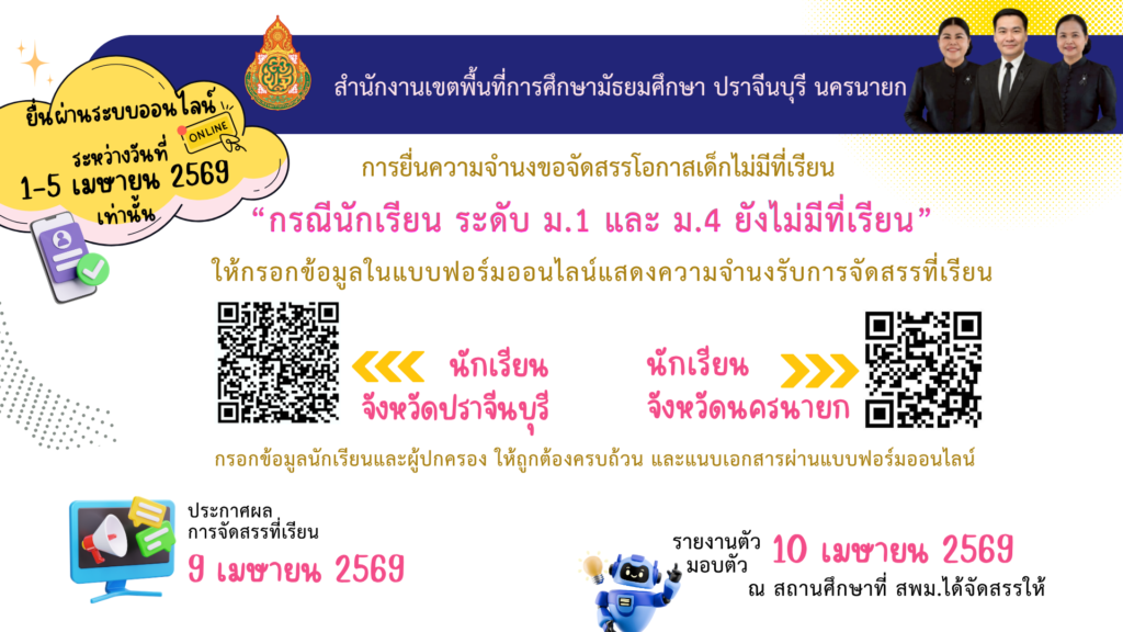ประกาศสำนักงานเขตพื้นที่การศึกษามัธยมศึกษาปราจีนบุรี นครนายก เรื่อง ประกาศตำแหน่งว่างข้าราชการครูและบุคลากรทางการศึกษา ตำแหน่งผู้บริหารสถานศึกษา สังกัดสำนักงานคณะกรรมการการศึกษาขั้นพื้นฐาน ประจำปี พ.ศ.2568 (เพิ่มเติม) ครั้งที่ 2