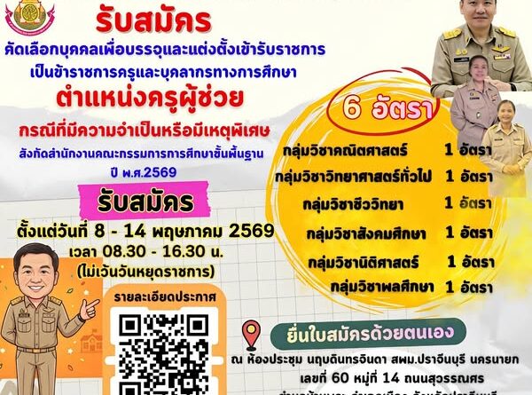 กลุ่มบริหารงานบุคคลประกาศสอบบรรจุ ย้ายและแต่งตั้งประชาสัมพันธ์ กลุ่ม/หน่วย/โรงเรียน admin 30 เมษายน 256930 เมษายน 2026 ประกาศ อ.ก.ค.ศ. เขตพื้นที่การศึกษามัธยมศึกษาปราจีนบุรี นครนายก การคัดเลือกบุคคลเพื่อบรรจุและแต่งตั้งเข้ารับราชการเป็นข้าราชการครูและบุคลากรทางการศึกษา ตำแหน่งครูผู้ช่วย กรณีที่มีความจำเป็นหรือมีเหตุพิเศษ สังกัดสำนักงานคณะกรรมการการศึกษาขั้นพื้นฐาน ปี พ.ศ. 2569 ดาวน์โหลดไฟล์ Read More